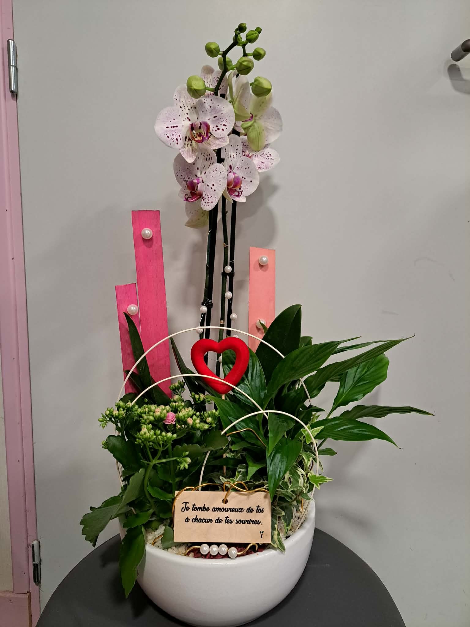 Informations importantes : Certaines plantes peuvent varier en fonction de la disponibilité en magasin. L’orchidée sera présente dans cet arrangement tout en ayant différents stades de floraison.