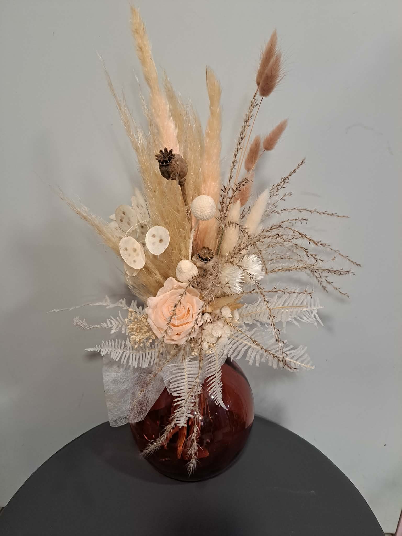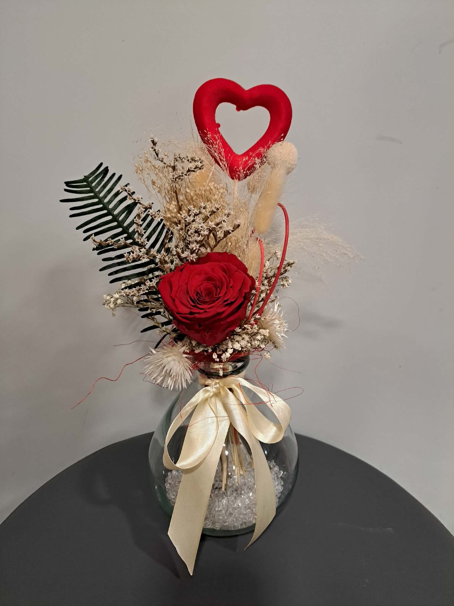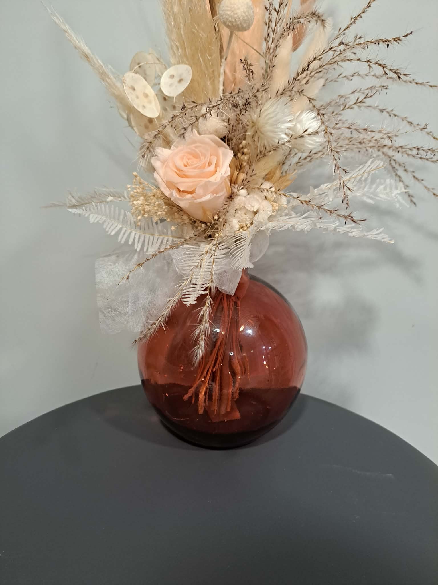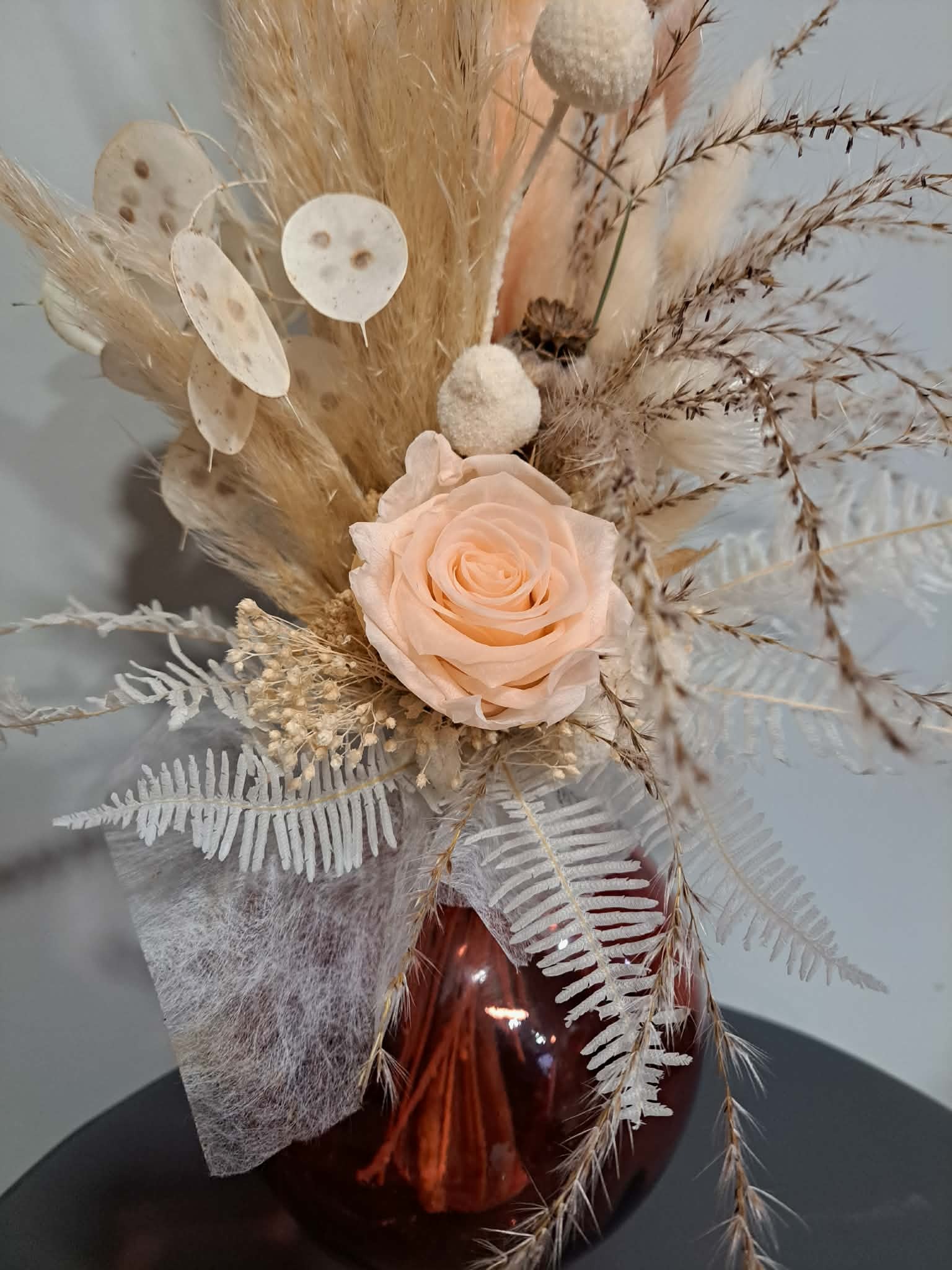 Bouquet de fleurs séchées et rose éternelle, accompagné de son joli vase moderne.