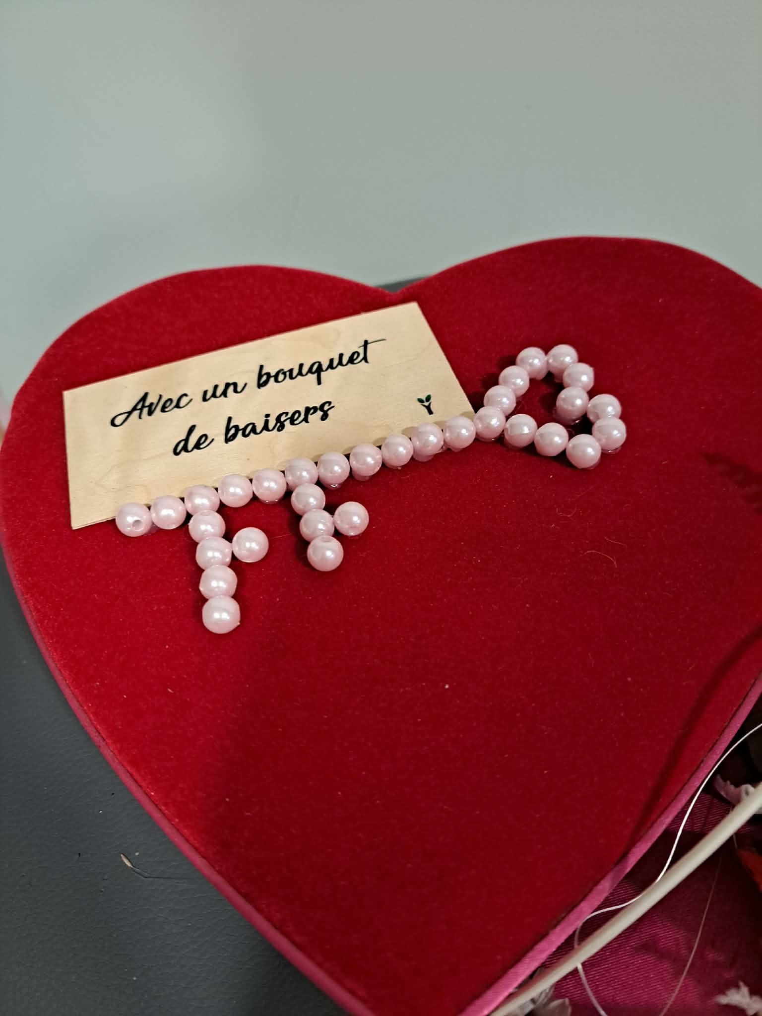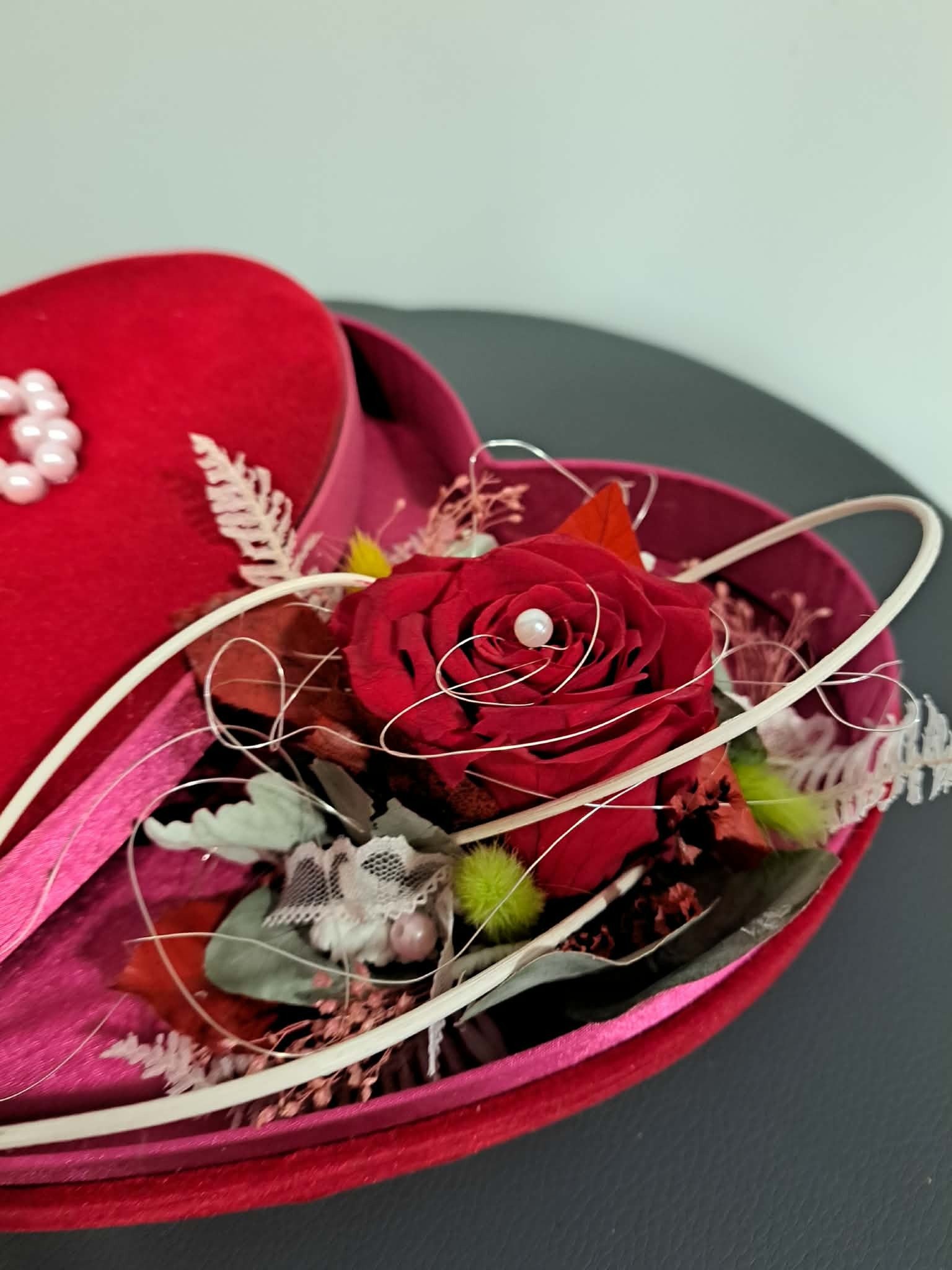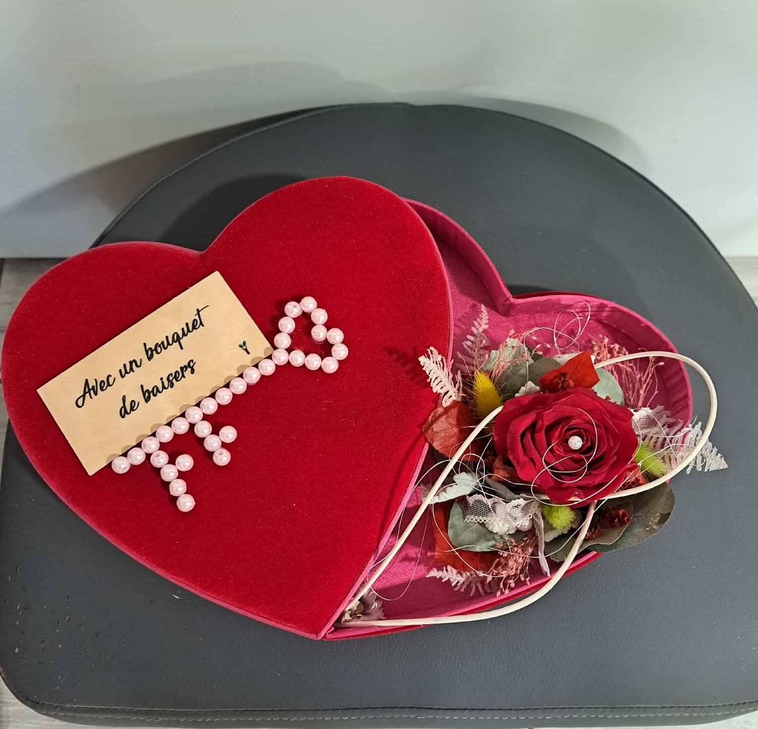 Découvrez notre jolie composition de rose éternelle accompagnée de son support coeur en feutrine !